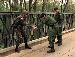 The 91st Engineer Battalion was reactivated at Fort Hood, Texas, on 16 October 1992, this time as part of the 1st Cavalry Division. Parts of the battalion served in Bosnia and Herzegovina during the Yugoslav Wars, and in 1995 deployed to Kuwait as part of Operation Intrinsic Action. A company also served in Chad.[3] In November 2001, Alpha Company deployed to Kuwait as part of Operation Enduring Freedom. From January 2004 to January 2005, the 91st Engineer Battalion served in Iraq as part of Operation Iraqi Freedom, for which it was awarded a second Meritorious Unit Commendation.[7][5] The battalion was assigned an area of operations encompassing most of the Mansour District of Baghdad, including the neighborhoods of Ghazilyah, Al Shula, Al Khadra, and Al Amiriyah. 5 soldiers from the battalion were killed during combat operations.[8]