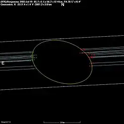 The asteroid had been observed in 7 stellar occultation events since 2003.[13] On 19 July 2003 the mag. 5.7 star HIP 88816 was occulted by the asteroid,[14] and was observed at 11 stations; 1 in Argentina, 3 in New Zealand, and 7 in Australia. From these observations, the best-fit ellipse measures 85.2 x 56.2 ±12.4 kilometres.