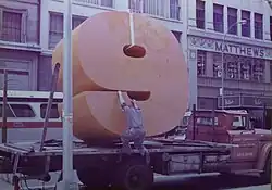 A red sculpture of the digit "9" on the 57th Street side of the building was designed by Ivan Chermayeff.[29][30][31] The sculpture weighs 6 short tons (5.4 long tons; 5.4 t) and measures about 10 feet (3.0 m) high by 5 feet (1.5 m) wide.[31] It faces east toward Fifth Avenue and is supported by a three-story column in the basement.[32] The sculpture was installed because Solow thought the plaza as designed was excessively large,[30] and also because Solow wanted to draw attention away from the bare walls of other nearby buildings.[33] The idea for the sculpture had come after Chermayeff had joked that the facade could be a "launching pad" for the "9".[32] After the sculpture was first installed in 1972, Solow had removed the sculpture for a year due to a dispute over where it should be placed.[34] He ultimately agreed to install the sculpture on the sidewalk, initially paying the city $1,000 annually in rent.[31] By the 1990s, the sculpture was described in The New York Times as "a cultural artifact as well as the building's signature".[35]