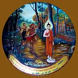 Aṅgulimāla asks for further explanation, after which the Buddha says that a good monk should control his desires.[54] Aṅgulimāla is impressed by the Buddha's courage,[55] and struck with guilt about what he has done.[56] After listening to the Buddha, Aṅgulimāla reverently declares himself converted, vows to cease his life as a brigand and joins the Buddhist monastic order.[57][58][59] He is admitted in the Jetavana monastery.[45]