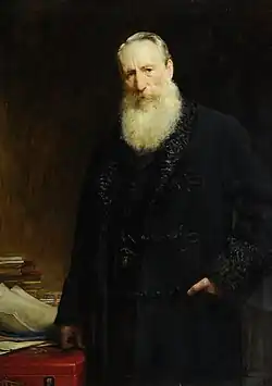 • Portrait in oil: by Sir Arthur Stockdale Cope RA (1857–1940). Painted on commission for the citizens of Sheffield to celebrate Mundella's 25th anniversary as an MP. A three-quarter length portrayal of Mundella as president of the Board of Trade with his hand resting on a departmental despatch box. The Sheffield Telegraph commented: "His face wears a somewhat sad and serious expression, and the artist has given him the full measure of his years".[56] The artist was Mundella's own choice. The painting was exhibited at the Royal Academy of Arts in London in the spring of 1894 and presented to Mundella on 11 Dec 1894 before being given to Sheffield Town Council.[57] It is on loan to Sheffield Galleries and Museums Trust.[58]