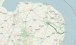 The road passes to the north of Beccles and crosses the Lowestoft to Ipswich railway line at a level crossing. It passes Beccles Common and to the north of Worlingham, travelling now in a more easterly direction before rejoining its original route near the villages of North Cove, where there is a roundabout junction with the A145, and Barnby.[4] Both villages are bypassed to the south by the modern road before it reaches the edge of the Lowestoft built up area at Carlton Colville. A relief road, the A1145, links Carlton Colville with the centre of Lowestoft whilst the A146 continues east.[2]