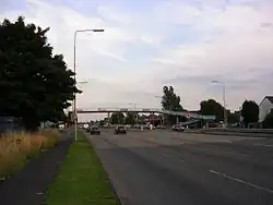 To be a high-speed trunk route, its 1930s planners designed some parts to be three roads in one. The central section was exclusively for through traffic while adjacent side roads – either side of the main carriageway – provided local access.[1] Although the sections within Liverpool were dual carriageway from the beginning, a few short stretches through Salford continue to use the original three-lane layout. The rest of the road was converted to dual with a central reservation in the 1950s and 1960s. Many of the original 1930s bridges remain; they were built from steel in preparation for any future expansion as they would be easier to replace than ones constructed from moulded concrete.