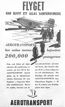 AB Aerotransport (ABA) was a Swedish government-owned airline which operated during the first half of the 20th century and was merged into what would become the SAS Group. ABA was established on 27 March 1924 under the name Aktiebolaget Aerotransport by Carl and Adrian Florman together with Ernst Linder, John Björk and Johan Nilsson.[1] Its first flight was on 2 June 1924 between Stockholm, Sweden and Helsinki, Finland.[2][3] Needing more funds, it became government-owned in 1935.[1] ABA was merged with Swedish Intercontinental Airlines (SILA) in 1948 and airline operations would ultimately be merged into the international SAS Group in 1950.