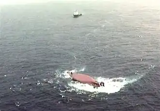Less than two months later, on April 12, she capsized with 15 Norwegian sailors aboard. Eight were picked up by vessels already on scene and two were found by Her Majesty's Coastguard, while five are still missing.[4] Three of the ten recovered were reported dead.[5] The incident happened while Bourbon Dolphin was anchoring the semi-submersible drilling platform Transocean Rather. The 99-man crew of the Rather was evacuated by the RAF.[6]