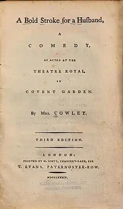 A Bold Stroke for a Husband is a 1783 comedy play by the British writer Hannah Cowley.[2] The title is a variation on Susanna Centlivre's A Bold Stroke for a Wife. The original Covent Garden cast included William Thomas Lewis as Don Julio, Richard Wroughton as Don Carlos, John Quick as Don Caesar, John Edwin as Don Vincentio, Richard Wilson as Gasper, John Whitfield as Don Garcia, James Fearon as Vasquez, Mary Robinson as Victoria, Sarah Maria Wilson as Minette, Mary Whitfield as Laura, Harriet Pitt as Sancha and Isabella Mattocks as Olivia. The epilogue was written by John O'Keeffe.[3] The play is in five acts and is set in Madrid.[4]