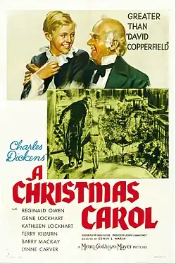 Made by Metro-Goldwyn-Mayer and originally intended to star Lionel Barrymore (who played the role of Scrooge annually on radio but was forced to drop out of the film because of his arthritis, though he narrated its trailer),[3] the movie starred Reginald Owen as Scrooge and the married couple Gene and Kathleen Lockhart as the Cratchits. Terry Kilburn costarred as Tiny Tim and a young June Lockhart (Gene and Kathleen's daughter) made her screen debut as one of the Cratchit daughters.[4] Leo G. Carroll played Marley's Ghost. The characters of Fred (Scrooge's nephew) and Elizabeth, his fiancée (his wife in the novelette), were greatly expanded in order to work in a romantic angle to the story that Dickens did not intend. The couple was played by Barry MacKay and Lynne Carver. Ann Rutherford, better known as Polly Benedict in the MGM Andy Hardy film series and as Carreen O'Hara in Gone with the Wind, was a young and attractive Ghost of Christmas Past, rather than the somewhat unusual creation that Dickens described.