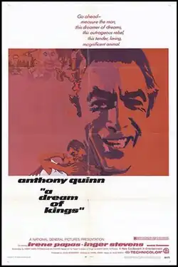A Dream of Kings is a 1969 drama film directed by Daniel Mann and written by Ian McLellan Hunter, adapted from the 1966 novel of the same name by Harry Mark Petrakis.[2] The film stars Anthony Quinn, Irene Papas, Sam Levene and Inger Stevens in her final film role, as she committed suicide four months after the film's release. Critics raved over Quinn's performance and those of the supporting cast.[3]