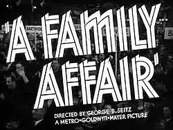 A Family Affair is a 1937 American comedy film directed by George B. Seitz and based on the 1928 play Skidding by Aurania Rouverol. It was the first of 16 films now known as the Andy Hardy series, although Andy Hardy did not become the main character in the series until several more installments had been made. The film stars Lionel Barrymore, Cecilia Parker, Eric Linden, Mickey Rooney and Charley Grapewin.[2]