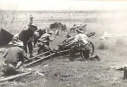 At the outbreak of the Second World War, A Field Battery came under the command of the School of Artillery, Holsworthy, in their mobilization role as Depot Battery.[5] However, in August 1943, A Field Battery was reorganized to form the 2nd Australian Mountain Battery, following the successful involvement of the 1st Mountain Battery during operations around Buna and Wau.[18] Equipped with 75 mm pack howitzers, under the command of Major William Stevenson the 2nd Mountain Battery arrived in New Guinea in September of that year, initially based around Port Moresby with the 3rd Division. In November, the battery was transferred to the 9th Division to provide support around Finschhafen.[19][18] In early 1944, the battery moved to Lae and was re-assigned to support the 7th Division in the Finisterre Ranges, where its operations were hampered due to limited transport in the difficult terrain.[20] The battery was moved to Dumpu in April 1944, where it came under the command of the 11th Division, before moving to Lae in May.[21]