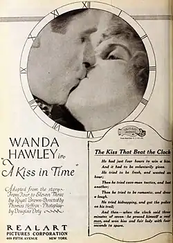 A Kiss in Time is a 1921 American silent comedy film directed by Thomas N. Heffron and written by Douglas Z. Doty. The film stars Wanda Hawley, T. Roy Barnes, Bertram Johns, Walter Hiers, and Margaret Loomis. The film was released in July 1921, by Realart Pictures Corporation.[1][2][3]
