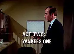 The episode starts inside the office of the Acme Credit Union. A young credit union teller[7] named Sally Decker (played by Kathryn Leigh Scott) is arguing with her boss, Jim Johnson, over a loan of money. Sally needs the money to pay a debt to her orthodontist. Johnson declines, saying that due to an upcoming audit, he has to balance the credit union's books and can't loan her any more money. The argument ends as customer Ralph Twice, recently laid off from the Lorman Tire Company, arrives to cash his last payroll check. During the extended identification process, Sally devises a scheme to solve her money problems: she shoots her boss and Mr. Twice, making it look like Twice was trying to rob the credit union by planting a gun on him. She pilfers the cash drawer and then begins screaming to attract attention. In a sight gag reminiscent of the toll booth scene in "Blazing Saddles", while the teller's cage has the usual heavy security set-up (mesh wire, bars, etc.) when seen straight on from the point of view of Twice, the camera then pans back, showing that Sally Decker's desk, placed side-by-side with the teller's window, is entirely open space and that any would-be robber could easily sidestep the security and enter the teller's cage from the side, which is entirely unprotected.