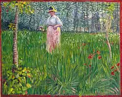 A Woman Walking in a Garden is an oil-on-canvas painting by Dutch Post-Impressionist painter, Vincent van Gogh. This painting was created in 1887 during the two years van Gogh lived in the northern suburbs of Paris.[1] There is a woman walking through a lush and green garden dotted with flowers and in the background there is a building concealed behind a thick row of trees. A red paint border along the edge of the canvas frames the scene.This painting is a part of the Riverbank in Clichy Triptych along with Fishing in Spring housed at the Art Institute of Chicago and River Bank in Springtime housed at the Dallas Museum of Art.[2][3] All three pieces have red borders as to indicate their association to each other in a triptych.[3]