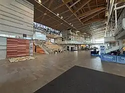 The Aaniin Community Centre is a public service building in Markham, Ontario, Canada.[1] The 3 story centre totals around 122,000 sq.ft. and sits on about 13 acres of land.[1] It contains a double gym, teaching kitchen, library, aquatics center, performance space, food concessions and support spaces.[2] On the property there are 3 large parking lots as well as basketball courts and seating spaces.[2]