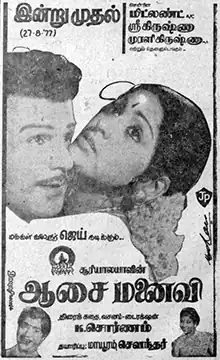 Aasai Manaivi (transl. Dearest wife) is a 1977 Indian Tamil-language comedy film[2] directed by K. Sornam, and produced by Mayuram Soundar. The film stars Jaishankar and Sujatha. It was released on 27 August 1977.[3]