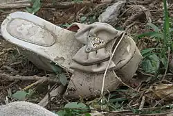 Abandoned footwear is regularly found intentionally placed or littered in inhabited areas.[1] There are many hypotheses about why footwear are found more than other types of clothing or why footwear is noticed more than other types of clothing.[2][3][4] Shoes are more sturdily constructed than most other types of clothing so they will last longer after being abandoned outdoors. Leather shoes, for instance, are estimated to last for 25–40 years outside.[5] Some shoe abandonment is intentional, as in shoe tossing, in which shoes are tied together by their laces and thrown into trees, over power lines, or over fences.[6] Other intentional shoe abandonment is for the purposes of a memorial, as in the case of ghost shoes.
