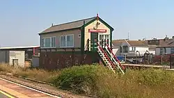 It was originally served by loops off the main line in both directions, but the eastbound one was removed in the late 1980s and the main line realigned to pass through the platform. However the westbound one remained in use until early 2017 - it was decommissioned over the weekend of 8/9 January. The loop has now been lifted and the platform extended out to reach the remaining main line. A replacement bus service was provided to Rhyl whilst the work was in progress, as westbound trains were not to call until the work was completed.[4] The platform reopened to traffic on 12 March 2017.[5] As part of the same modernisation scheme, the signal box here was abolished in March 2018, when new colour light signalling was commissioned between Colwyn Bay and Shotton.