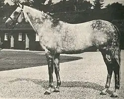 Abernant was a dark-grey horse bred by Catherine Macdonald-Buchanan and raced in the colours of her husband Reginald Macdonald-Buchanan. He was sired by the Epsom Derby winner Owen Tudor, by Hyperion, a son of the English Triple Crown winner, Gainsborough. Abernant's dam, Rustam Mahal, was a non-winning daughter of Rustom Pasha and the very important broodmare Mumtaz Mahal who in turn was sired by The Tetrarch.[1] Abernant was a half brother to Kurdistan (by Tehran) who was a successful sire in New Zealand, siring among others, Baghdad Note, a winner of the Melbourne Cup.[3][4] horse during his racing career although like all grey horses, his coat lightened as he aged. Abernant was sent into training with Noel Murless at Beckhampton in Wiltshire.