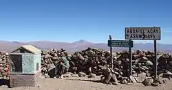 The Abra del Acay in La Poma Department, Salta Province, Argentina is the highest point on Argentina's National Route 40. Located at , its altitude is 4,972 meters (16,312 ft),[1] even though an old sign informs visitors it stands at 4,895 meters (16,060 ft).