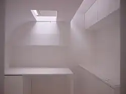 In the course of six years Absalon created a series of one person living units based on everyday routine actions and designed entirely in relation to his measures. The inside of the cell is all covered in white in order to reduce distractions or elements that can disturb the eye. In his video Solutions (1992) Absalon demonstrate the study of measurements and calculation of movements like eating, sleeping, taking shower which later will define the form of his cells. In 1993 Absalon started to construct six cells which were supposed to be installed in six metropolitan centers[6] as Absalon described in interview: "I would like to create my own setting and belong to nothing else. My living unit will be comprised of the six habitation units which I construct, and my homeland will be in-between them."[7]