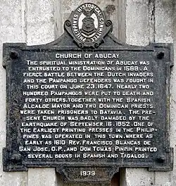 The church housed one of the earliest printing presses in the Philippines, established in 1608 by Father Francisco Blancas de San Jose, O.P. and Tomas Pinpin who used the facility to print books in Spanish and Tagalog.[3][4] The church was also a witness to the massacre of hundreds of Filipinos and Spaniards by the Dutch Invaders on June 23, 1647.[5] These pieces of the church's history were inscribed on a historical marker installed by the National Historical Committee (now the National Historical Commission of the Philippines) in 1939.[6]