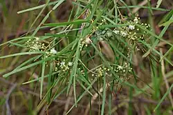 Acacia acrionastes is a spindly, glabrous shrub or tree that typically grows to a height of 2–8 m (6 ft 7 in – 26 ft 3 in). It has linear phyllodes that are 60–190 mm (2.4–7.5 in) long and 2–5 mm (0.079–0.197 in) wide and often narrower towards the tip. The flowers are arranged in a raceme 20–45 mm (0.79–1.77 in) long with 10 to 16 heads on a peduncle 3–6 mm (0.12–0.24 in) long, each head with 12 to 16 creamy yellow flowers. Flowering mainly occurs between July and August and the fruit is a leathery pod up to 100 mm (3.9 in) long and 8–10 mm (0.31–0.39 in) wide, containing up to nine seeds with a shiny black, club-shaped aril.[2][3][4][5]