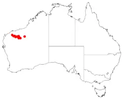 Bromilow's wattle is native to an area of the Pilbara region of Western Australia and is found in a variety of situations including creek beds, rocky hills, scree slopes, gorges, and breakaways, growing in skeletal stony loam soils that are pebbly to gravelly over laterite, ironstone and basalt.[2] The bulk of the population is situated on the Hamersley Range from around Tom Price through the Ophthalmia Range and on the Hancock Range to around Newman. Another population is found on Balfour Downs Station to the northeast of Newman.[5] It is often found amongst open low eucalypt woodlands communities consisting of Eucalyptus leucophloia and Corymbia hamersleyana over spinifex.[5]