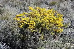 Acacia chapmanii is a dense, intricately-branched shrub that typically grows to a height of 0.5–2 m (1 ft 8 in – 6 ft 7 in) and has glabrous branchlets. Its phyllodes are sessile, usually continuous with the branchlets, needle-shaped, 20–30 mm (0.79–1.18 in) long, 0.7–1 mm (0.028–0.039 in) wide, rigid and green to more or less glaucous with a sharp point on the tip. There are stipules 1–3 mm (0.039–0.118 in) long at the base of the phyllodes. The flowers are borne in a spherical head in axils on a peduncle 10–15 mm (0.39–0.59 in) long, each head 4–5 mm (0.16–0.20 in) in diameter with 14 to 27 golden yellow flowers. Flowering time depends on subspecies, and the pods are glabrous, strongly curved to coiled, up to 40 mm (1.6 in) long and 2.5–3.0 mm (0.098–0.118 in) wide with broadly elliptic seeds 2.5–3.0 mm (0.098–0.118 in) long, with a more or less club-shaped aril.[2][3][4][5]