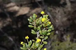 Acacia crassuloides is a glabrous, dense, cushion-like, spreading shrub that typically grows to a height of 15–50 cm (5.9–19.7 in) and often forms prostrate mats. Its phyllodes are ascending, thick and fleshy, egg-shaped with the narrower end towards the base to oblong, 4–10 mm (0.16–0.39 in) long, 1.3–3 mm (0.051–0.118 in) wide and flattened to convex with one vein on the lower surface. The flowers are borne in two spherical heads in racemes on peduncles 2–8 mm (0.079–0.315 in) long. The heads are about 3 mm (0.12 in) in diameter with 7 to 10 golden yellow flowers. Flowering occurs from about September and October, and the pods are oblong, up to 15 mm (0.59 in) long, 3–4 mm (0.12–0.16 in) wide and S-shaped to curved, sometimes in a complete circle. The seeds are pear-shaped, 2.0–2.5 mm (0.079–0.098 in) long, shiny, light grey with a club-shaped aril more than half the length of the seed.[2][3][4][5][6]
