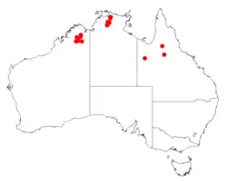 It is native to an area in the Kimberley region of Western Australia[1] and the top end of the Northern Territory. It is usually situated on stony or rocky plateaux or hillslopes often in shrubland or open Eucalyptus savannah communities.[2]