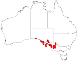 It is found in north western parts of Victoria with its range extending into eastern parts of South Australia growing in sandy or loamy soils in mallee or open woodland communities. In Victoria it is found scattered through the Mallee and Wimmera regions.[1] In South Australia it is scattered across the southern coast to around Yalate to the north west of the Eyre Peninsula.[2]