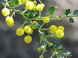 The obconic shrub typically grows to 0.5 to 2 m (1 ft 8 in to 6 ft 7 in) high[2] with slightly hairy branchlets with persistent narrowly triangular thickened stipules that are 0.5 to 1 mm (0.020 to 0.039 in) in length. It has phyllodes that are 6 to 15 mm (0.24 to 0.59 in) long and 4 to 9 mm (0.16 to 0.35 in) wide. They are erect and have an obliquely oval or elliptic shape with two or three raised main nerves.[3] Yellow globular flowerheads appear from August to November in the species' native range.[2] The globular to obloid flowerheads have a diameter of around 5 mm (0.20 in) and contain 45 to 60 flowers. Narrowly oblong seed pods form after flowering with a length of around 3 cm (1.2 in) and a width of 4 to 7 mm (0.16 to 0.28 in). The ovate shaped brown seeds within have a length of around 3 mm (0.12 in) and are arranged longitudinally.[3]