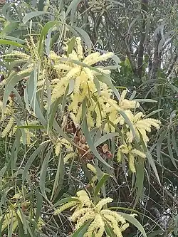 The shrub typically grows to a height of 3 to 5 m (9.8 to 16.4 ft) or a small tree typically grows to a maximum height of 3 to 9 m (9.8 to 29.5 ft) and sometimes as high as 12 m (39 ft) It has grey-brown fissured bark and slender branchlets that are angled at the extremities. Like most species of Acacia it has phyllodes rather than true leaves. The glabrous pale green to dark grey green phyllodes are dimidiate and curved like a sickle with a length of 5 to 4 cm (2.0 to 1.6 in) and a width of 0.4 to 3 mm (0.016 to 0.118 in). The phyllodes have many parallel longitudinal nerves with four to seven per millimetre.[1] It blooms between January and May producing inflorescences that occur singly or in pairs in the axils, the cylindrical flower-heads have a length of 2 to 7 cm (0.79 to 2.76 in) with flowers that are a pale yellow to lemon yellow colour. The glabrous and resinous seed pods are straight to moderately curved and usually twisted. The woody pods are 2.5 to 10 cm (0.98 to 3.94 in) in length and 10 to 20 mm (0.39 to 0.79 in) wide with thickened margins. The seeds inside are arranged transversely and have a creamy grey to grey funicle that is folded.[2]