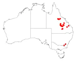 The shrub is found in Central Queensland from around Kroombit Tops National Park in the south east to around Springsure in the south west and up to around the White Mountains in the north where it is found on rugged rocky sandstone country as a part of scrub or Eucalyptus woodland communities.[1]