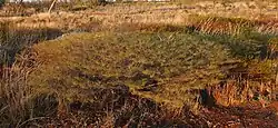 The low spreading, viscid shrub typically grows to a height of 0.2 to 1 metre (1 to 3 ft).[2] The obscurely ribbed branches normally spread horizontally giving the shrub a flat-topped appearance. The green to grey-green phyllodes are solitary or sometimes in clusters of two or three at the nodes. Each phyllode is 2 to 7 centimetres (0.8 to 2.8 in) in length and has a diameter of about 1 millimetre (0.04 in) and are straight or curve shallowly upward.[1] It blooms from March to October producing golden yellow flowers.[2] The simple inflorescences have an erect flower spike that is 10 to 45 mm (0.4 to 1.8 in) in length. Following flowering flat, thick and linear dark brown seed pods with a length of 2 to 8 cm (0.8 to 3.1 in) and a width of 2 to 6 mm (0.08 to 0.24 in). The erect and woody pods are sticky with resin and have an odour resembling like citronella or lemon grass. The ellipsoidal dull to slightly shiny brown seeds are 3 to 5.5 mm (0.12 to 0.22 in) long.[1]