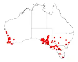 It is native to the Flinders Range, Gawler Range and Eyre Peninsula of South Australia. In these areas it is found among rocky outcrops on hillsides or along rocky creek beds.[3] The shrub is now also found in parts of New South Wales[6] and western Victoria where it is an invasive species.[3] It also is invasive in Western Australia where it is also an invasive species that has become naturalised. It has a sporadic distribution in an area through the South West, Wheatbelt and Great Southern regions[4] where it is found among jarrah forest in sandy soils.[3]
