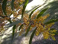 The branches of the Acacia macradenia plant are hairless and smooth. Generally, the younger part of the stem is green and the older parts are brown. Known as phyllodes, the leaf-likes are actually flattened leaf-stalks or petioles. Initially they are bipinnate. The darker phyllodes are typically older and longer have a lanceolate leaf shape compared to the younger phyllodes which are much smaller in size and shape.[1] The A. macradenia plant or tree can grow up to 5 m in height and 4 m spread.[3] The branches are pendulous (loosely hanging) to subpendulous and flexuose (fully bending).