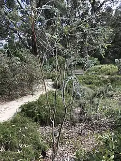 The open spindly shrub typically grows to a height of 2 to 4 metres (6.6 to 13.1 ft). It has glabrous branchlets that are covered in a fine white powdery which are roughened by scars of fallen phyllodes. Like most species of Acacia it has phyllodes rather than true leaves. The coriaceous grey-green phyllodes have an elliptic to ovate shape that is commonly shallowly concave and reflexed. The phyllodes are 1.5 to 3.5 cm (0.59 to 1.38 in) in length and have a width of 7 to 15 mm (0.28 to 0.59 in) and have a slightly raised midrib and also have a fine white powdery coating.[1] It blooms from April to June and produces yellow-cream flowers.[2] The axillary or terminal inflorescences are found along an raceme axes with a length of 10 to 40 mm (0.39 to 1.57 in) with spherical to obloid shaped flower-heads that have a diameter of 5 to 6 mm (0.20 to 0.24 in) and contain 45 to 65 light golden coloured flowers. Following flowering thinly coriaceous seed pods form that have a linear shape but are constricted between and rounded over each of the seeds. The pods have a length of up to 6 cm (2.4 in) and a width of 5 to 6 mm (0.20 to 0.24 in) and are covered in a fine white powdery coating with longitudinally arranged seeds inside. The dull dark brown seeds have an oblong to elliptic shape with a length of around 4 mm (0.16 in).[1]