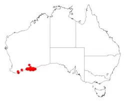 It is native to an area along the south coast in the Goldfields-Esperance region of Western Australia where it is commonly situated on flat or undulating sandplains or along the margins of salt lakes growing in sandy soils over or around limestone[1] or sandy-loamy, clay or gravelly soils The bulk of the population is found from around Young River in the west to around Israelite Bay in the east and extending as far north as 130 km (81 mi) where it is often a part of open shrub mallee over heathland communities.[2]