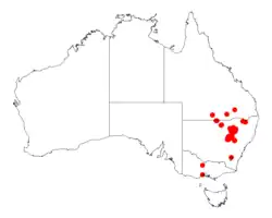 It is endemic to and has a disjunct distribution in north eastern New South Wales and south Queensland where it is found in Pillaga scrubland to around Gulgong and the Goonoo State Forest in the south where it is found in sandy soils as a part of dry sclerophyll forest communities.[2][1]