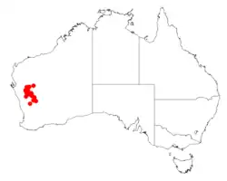 It is native to an area in the Mid West and Wheatbelt regions of Western Australia where it is often situated on hills and amonggranite outcrops growing in shallow sand or clay-sand soils.[1] The range of the shrub extends from the Weiragoo Range located about 180 km (110 mi) to the west of Meekatharra in the north west down to around Paynes Find in the south where it is usually a part of open scrub land communities.[2]