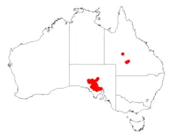 It is endemic to southern parts of central South Australia from the northern parts of the Eyre Peninsula in the south to around areas to the west of the Gawler Range and to just north of Tarcoola where it is usually situated on rocky hillsides and ridges that are composed of granite as a part of open and tall shrubland or low woodland communities.[2] It is often associated with other species of Acacia including Acacia aneura, Acacia cibaria and Acacia papyrocarpa growing in shallow compact loamy soils and alkaline red duplex and brown calcareous soils in areas where the average rainfall is 200 to 350 mm (7.9 to 13.8 in) per annum.[3]
