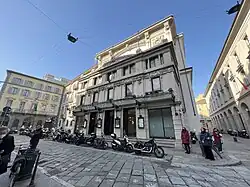 The theatre was designed by neoclassic architect Luigi Canonica, based on Giuseppe Piermarini’s drawings. The original structure was replaced in 1904 with an Art Nouveau building by architects Laveni and Avati. Of that structure, only the façade was preserved, with stucco and iron decorations and floral weaving, typical of the time. The interior was completely rebuilt by the architect Luigi Caccia Dominioni in the 1960s, due to its partial destruction during Second World War bombings.[3]