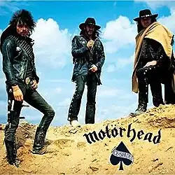 Like the song "Shoot You in the Back", the Ace of Spades artwork employs a classic wild west motif. Originally the idea for the album cover was to have it in a sepia tone and have gunfighters at a card table, but the band decided against it. They decided instead to have themselves in the desert dressed as cowboys. The 'Arizona desert-style' pictures used on the album sleeve and tour programme were taken during a photo session at a sandpit in Barnet.[7] Each of their cowboy outfits were based on different type of Western protagonist. Eddie was based on Clint Eastwood's character, The Man with No Name from the Dollars Trilogy. Phil's costume was based on Marlon Brando's character Rio in One-Eyed Jacks. Lemmy's costume was claimed by Phil to be inspired from Bret Maverick from the TV show Maverick. Contrary to popular belief, the sky was not real and was airbrushed in due to it being very cloudy that day.[8]