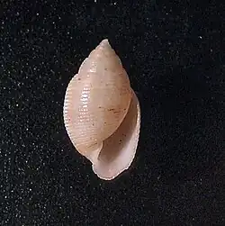 • Description : sublittoral on sandy bottoms; convex, cream-colored shell with five whorls, each whorls is covered with transverse pink-colored to light brown patterns, without dark borders; whirls with prominent shoulder.
