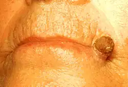Actinic keratosis (AK), sometimes called solar keratosis or senile keratosis,[1][2] is a pre-cancerous[3] area of thick, scaly, or crusty skin.[4][5] Actinic keratosis is a disorder (-osis) of epidermal keratinocytes that is induced by ultraviolet (UV) light exposure (actin-).[6]