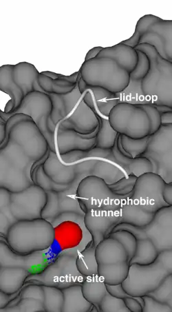 Acyl-protein thioesterases feature 3 major structural components that determine protein function and substrate processing: 1. A conserved, classical catalytic triad to break ester and thioester bonds;[2] 2. A long hydrophobic substrate tunnel to accommodate the palmitoyl moiety, as identified in the crystal structures of human acyl-protein thioesterase 1,[2] human acyl-protein thioesterase 2[13] and Zea mays acyl-protein thioesterase 2;[14] 3. A lid-loop that covers the catalytic site, is highly flexible and is a main factor determining the enzyme's product release rate.[14]