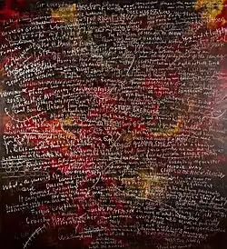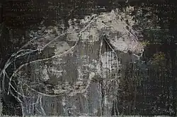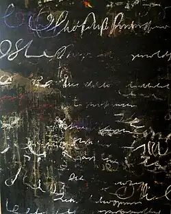 He will frequently work on a painting for an entire day, later to completely scrape off all the paint that was applied, leaving only remnants of the paint that found its way into previously gouged out areas. He works like this over the course of years to build a single painting, with its layers mostly never seen by the viewer though they impart a sense of history. Throughout the process the use of language — written, painted, or scraped into the paint — is actively employed, expressing poetic, philosophical and personal messages, most of which get covered over or remain as fragmentary relics.