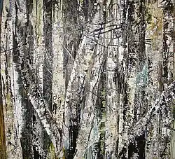 His work expands the tradition of abstraction by reliance on classical painterly techniques and a view towards the referential. He has explored numerous directions loosely referred to as landscape, flowers, trees, and work using language as an element.
