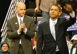 Adam Smith and Barack Obama at a campaign rally at Seattle's KeyArena, February 8, 2008.